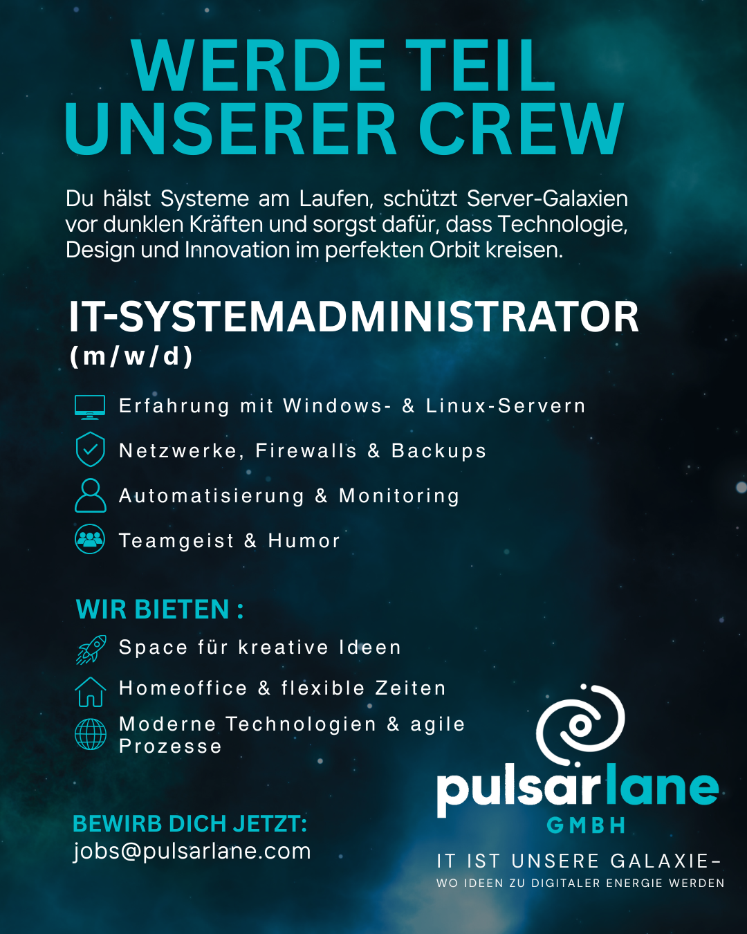 Bei Pulsarlane erwartet Dich ein dynamisches, technologiebegeistertes Umfeld, in dem du eigenverantwortlich arbeiten, neue Ideen einbringen und dich fachlich weiterentwickeln kannst.